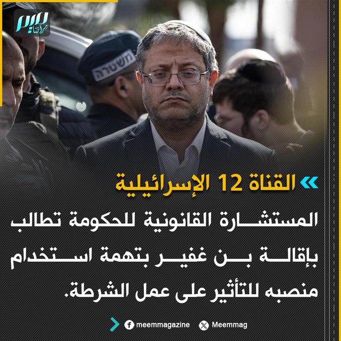 القناة 12 الإسرائيلية: المستشارة القانونية للحكومة تطالب بإقالة بن غفير بتهمة استخدام منصبه للتأثير على عمل الشرطة.