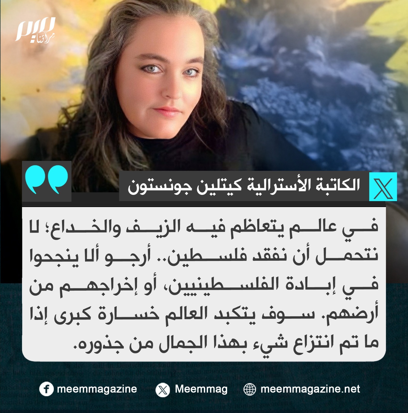 الكاتبة الأسترالية كيتلين جونستون: في عالم يتعاظم فيه الزيف والخداع؛ لا نتحمل أن نفقد فلسطين!