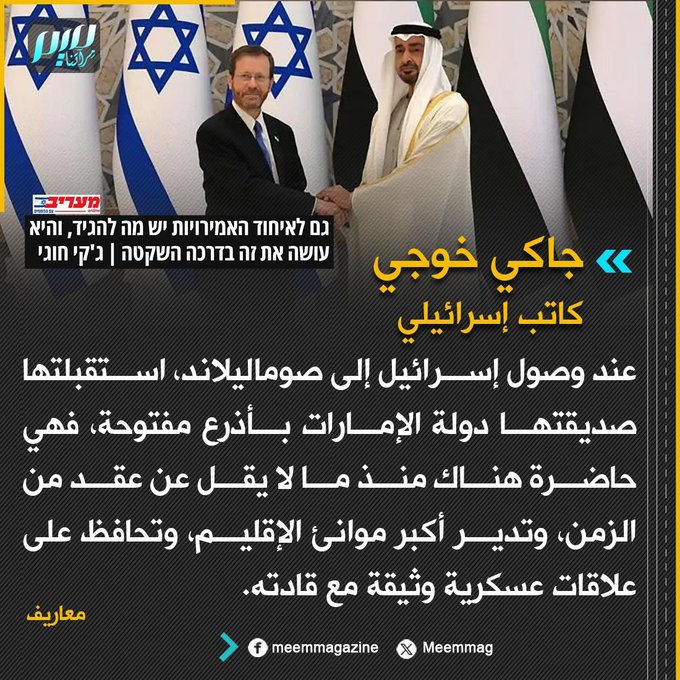 الكاتب الإسرائيلي جاكي خوجي: عند وصول إسرائيل إلى صوماليلاند، استقبلتها صديقتها دولة الإمارات بأذرع مفتوحة!