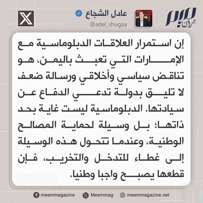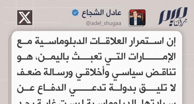 الكاتب اليمني عادل الشجاع: استمرار العلاقات الدبلوماسية مع الإمارات التي تعبث باليمن، هو تناقض سياسي وأخلاقي ورسالة ضعف لا تليق بدولة تدعي الدفاع عن سيادتها.
