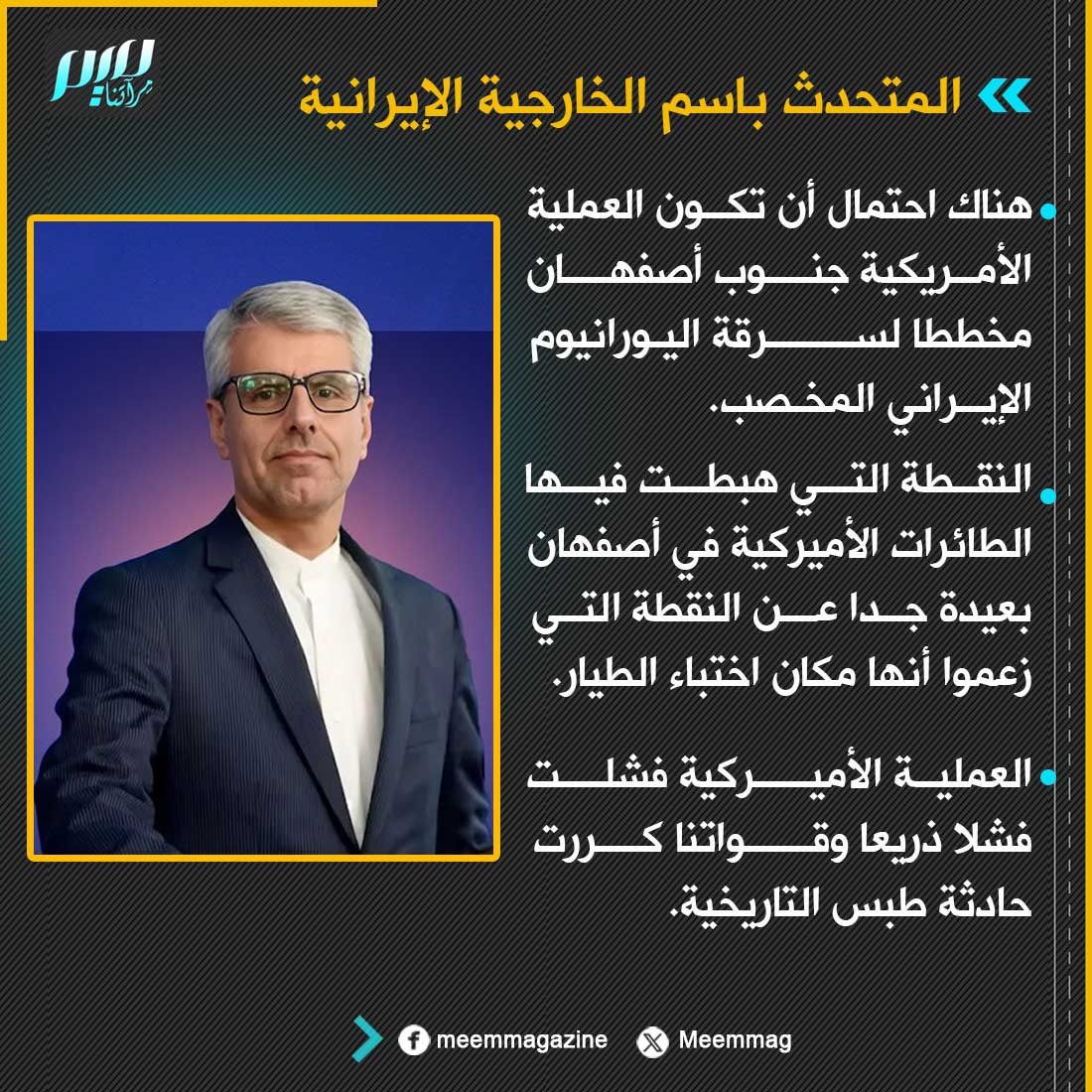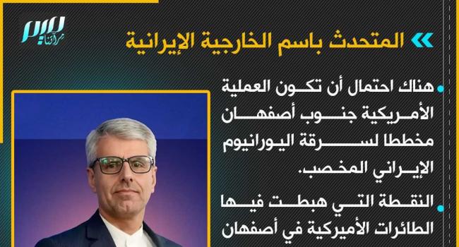 المتحدث باسم الخارجية الإيرانية: هناك احتمال أن تكون العملية الأمريكية جنوب أصفهان مخططا لسرقة اليورانيوم الإيراني المخصب.