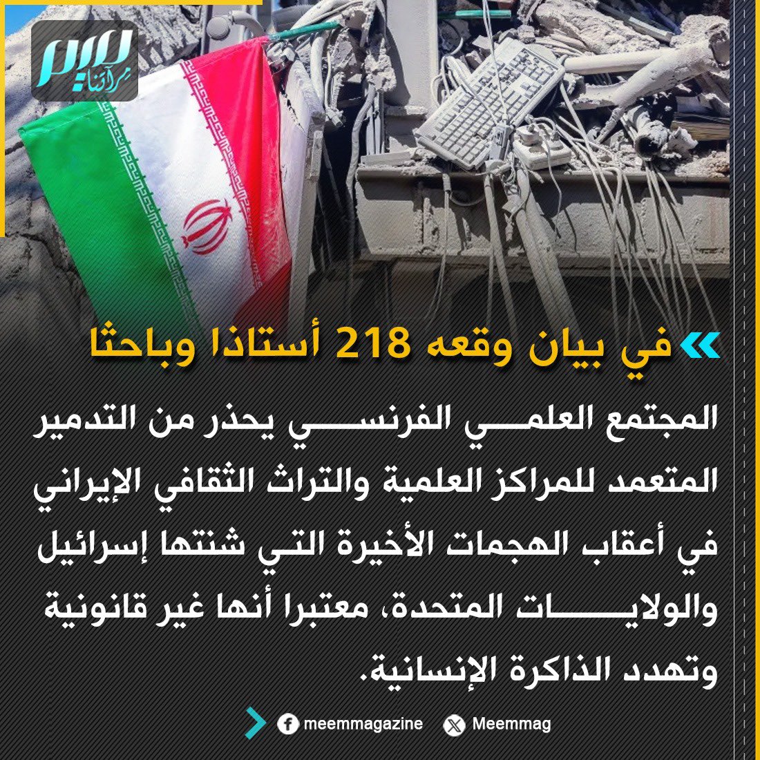 المجتمع العلمي الفرنسي يحذر من التدمير المتعمد للمراكز العلمية والتراث الثقافي الإيراني في أعقاب الهجمات الأخيرة التي شنتها إسرائيل والولايات المتحدة، معتبرا أنها غير قانونية وتهدد الذاكرة الإنسانية.