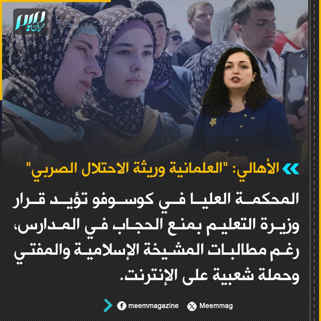 المحكمة العليا في كوسوفو تؤيد قرار وزيرة التعليم بمنع الحجاب في المدارس، رغم مطالبات المشيخة الإسلامية والمفتي وحملة شعبية على الإنترنت، وأهالي الطالبات يرفعون شعار: "العلمانية في البلاد وريثة الاحتلال الصربي".