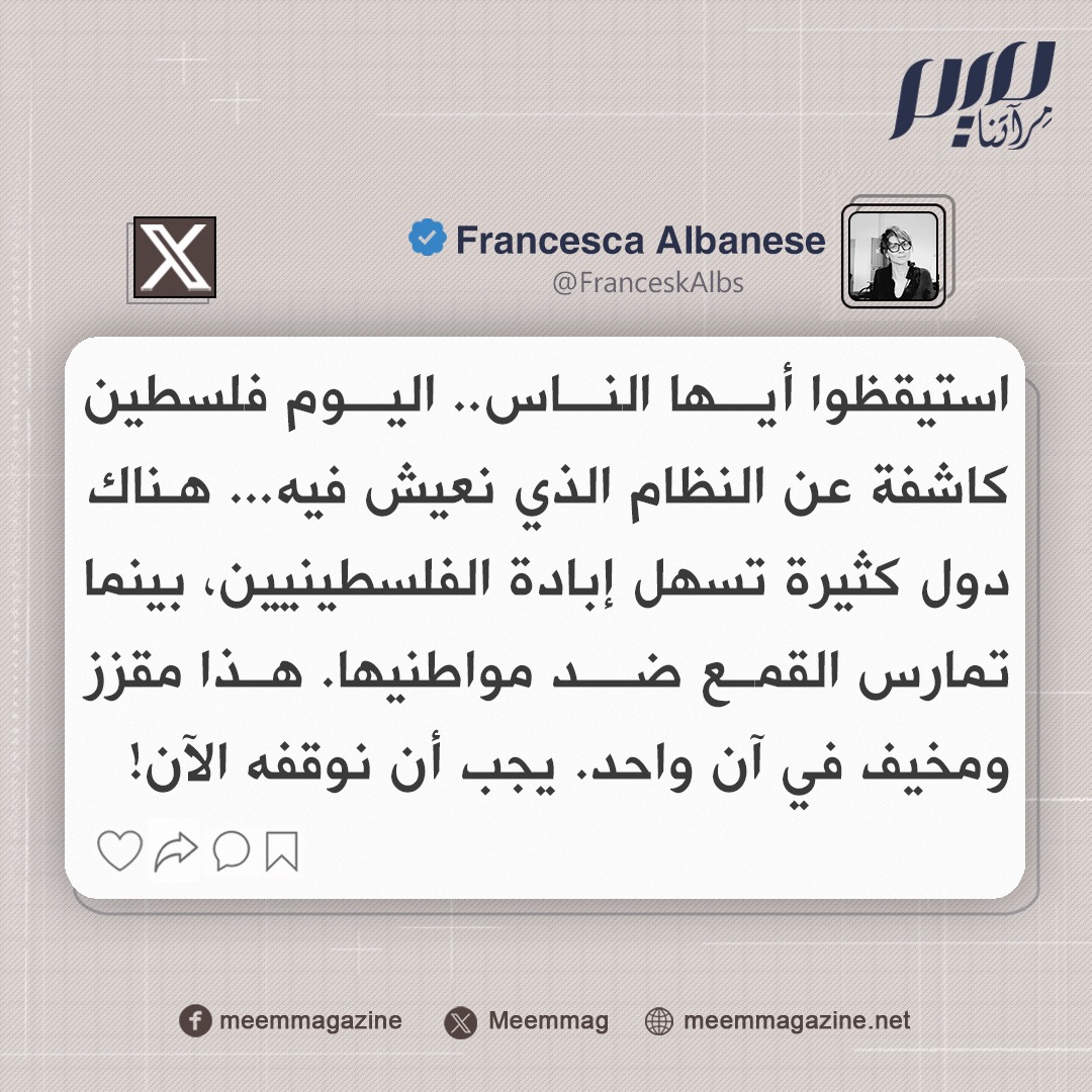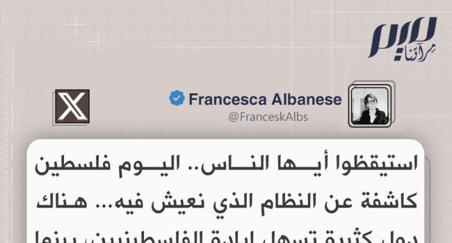 المقررة الأممية فرانشيسكا ألبانيز: هناك دول كثيرة تسهل إبادة الفلسطينيين، بينما تمارس القمع ضد مواطنيها. هذا مقزز ومخيف في آن واحد. يجب أن نوقفه الآن!