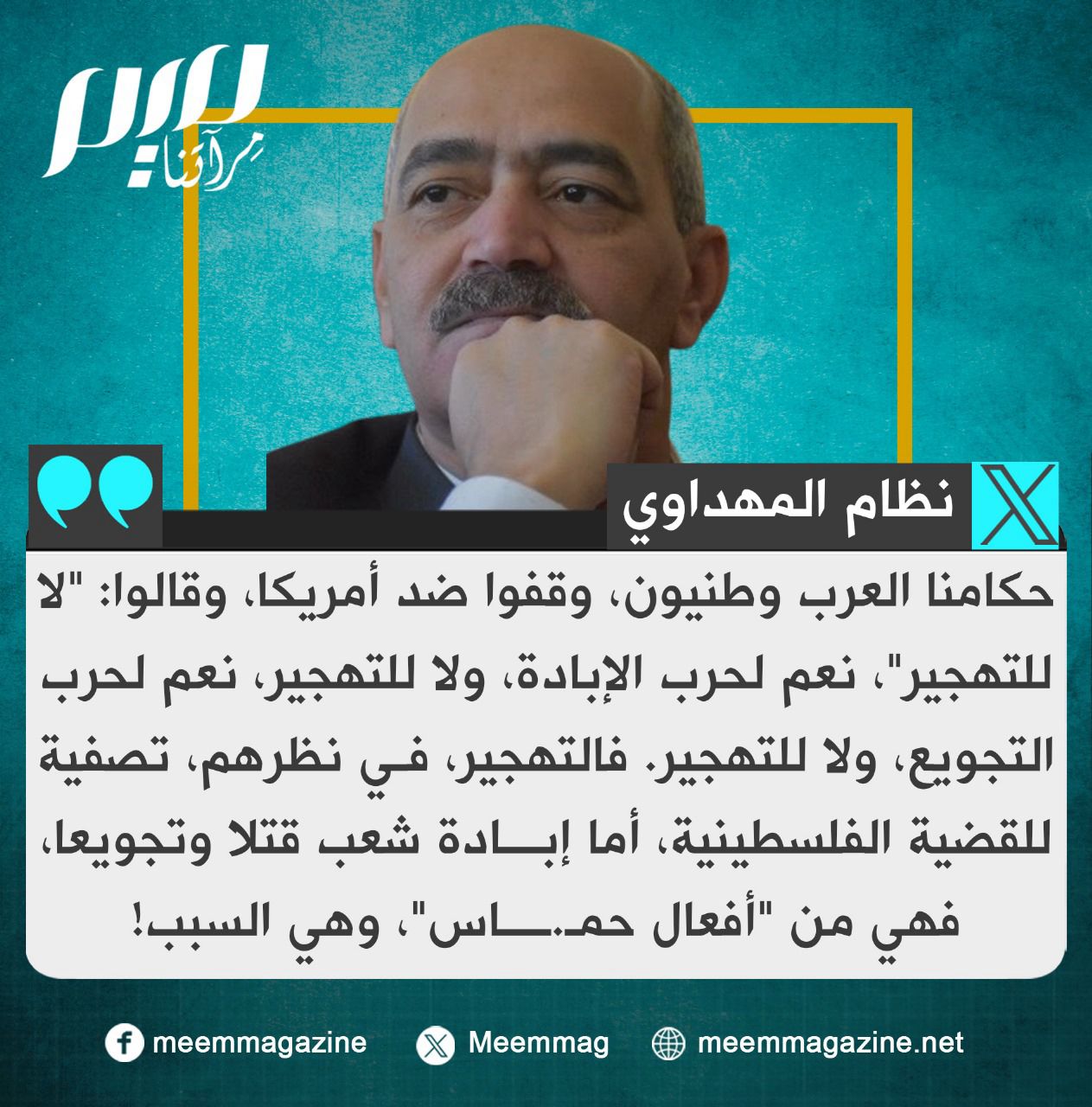 المهداوي: حكامنا العرب وطنيون، وقفوا ضد أمريكا، وقالوا: "لا للتهجير"، نعم لحرب الإبادة، ولا للتهجير، نعم لحرب التجويع، ولا للتهجير. فالتهجير، في نظرهم، تصفية للقضية الفلسطينية، أما إبادة شعب قتلا وتجويعا، فهي من "أفعال حمـ.ــــاس"، وهي السبب!
