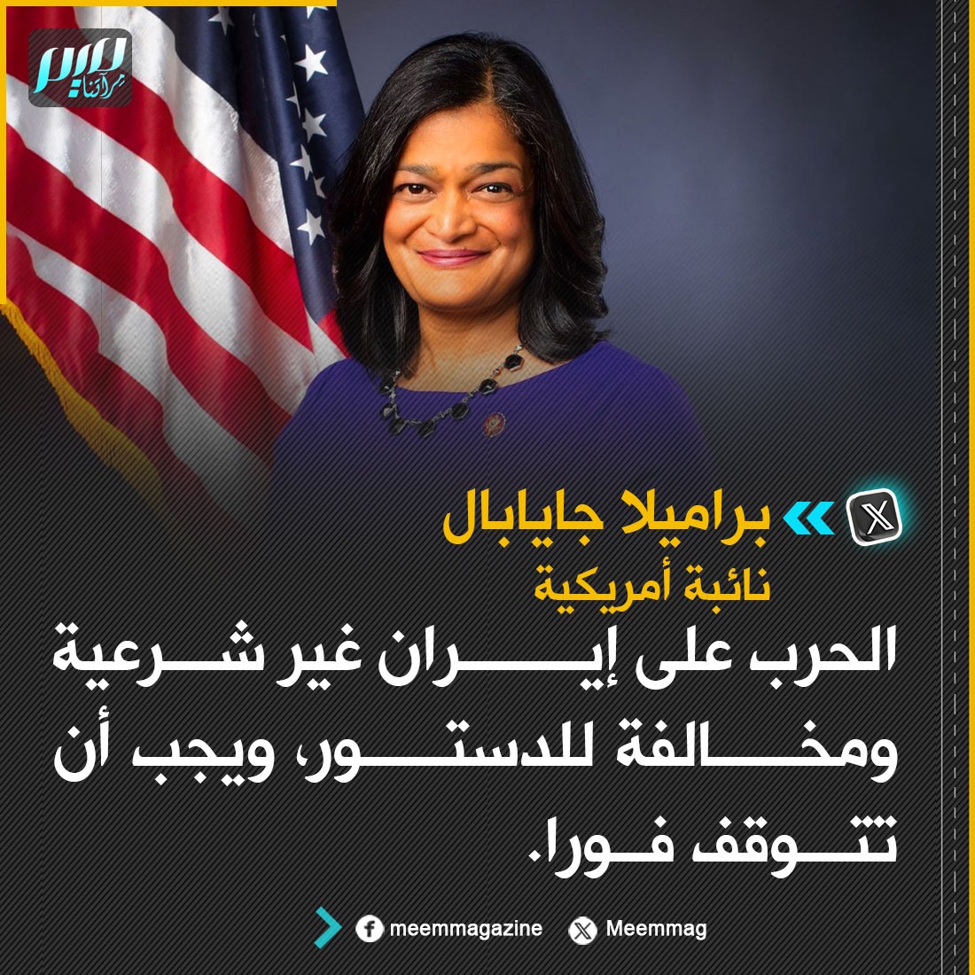 النائبة الأمريكية براميلا جايابال: الحرب على إيران غير شرعية ومخالفة للدستور، ويجب أن تتوقف فورا.