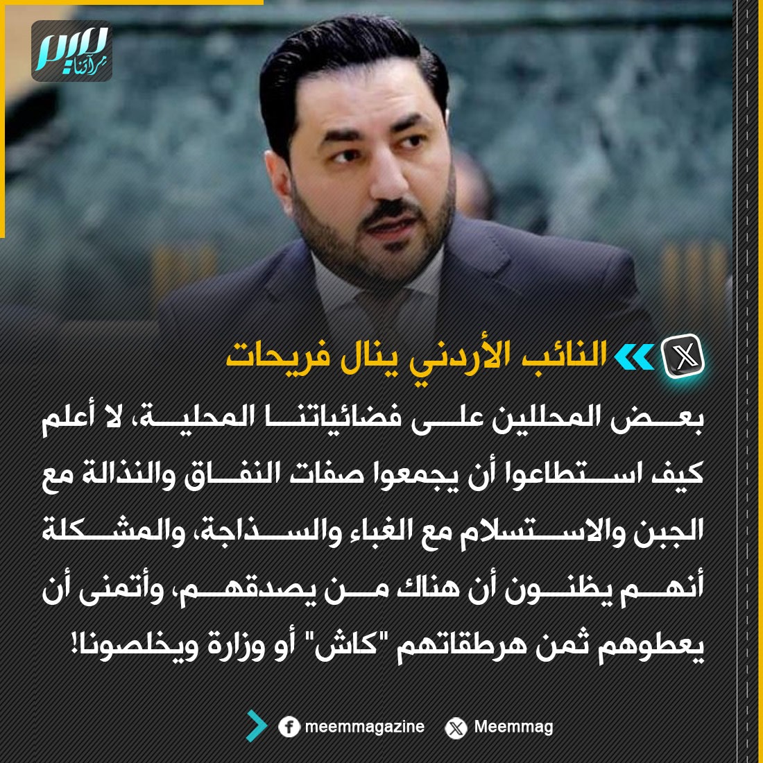 النائب الأردني فريحات يسخر من بعض المحللين على فضائيات بلاده، ويدعو لإعطائهم رتبة "وزير" أو الدفع لهم "كاش" للخلاص من "هرطقاتهم".