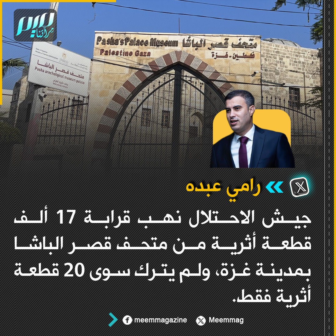 الناشط الحقوقي رامي عبده: جيش الاحتلال نهب قرابة 17 ألف قطعة أثرية من متحف قصر الباشا بمدينة غزة، ولم يترك سوى 20 قطعة أثرية فقط.