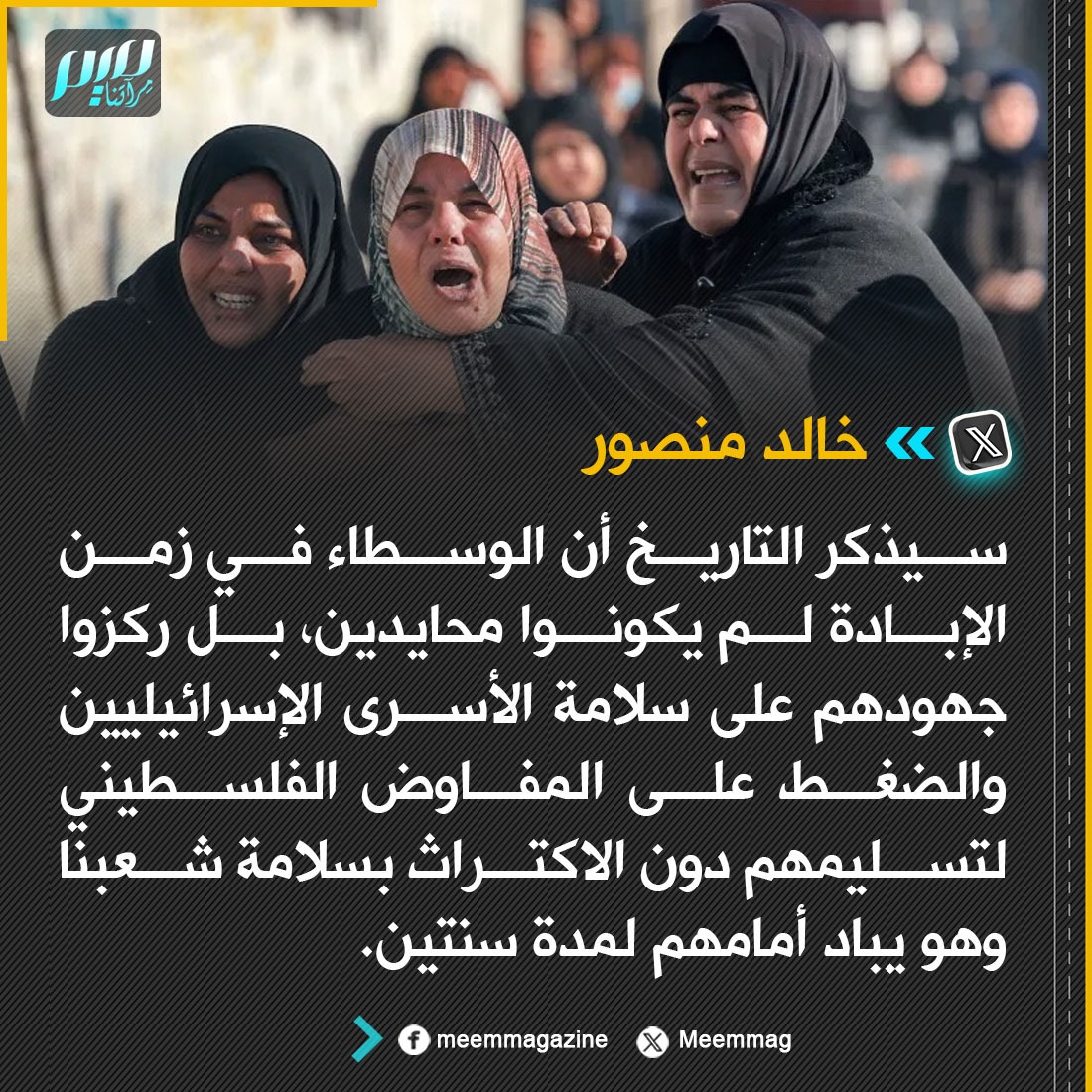 الناشط الغزي خالد منصور: سيذكر التاريخ أن الوسطاء في زمن الإبادة لم يكونوا محايدين، بل ركزوا جهودهم على سلامة الأسرى الإسرائيليين والضغط على المفاوض الفلسطيني لتسليمهم دون الاكتراث بسلامة شعبنا وهو يباد أمامهم لمدة سنتين.