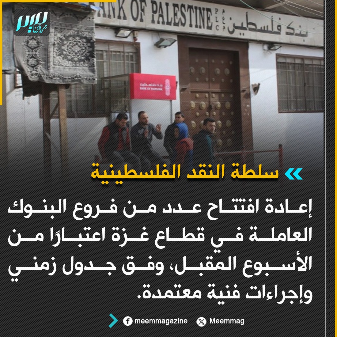 النقد الفلسطينية: إعادة افتتاح عدد من فروع البنوك العاملة في قطاع غزة اعتبارًا من الأسبوع المقبل، وفق جدول زمني وإجراءات فنية معتمدة.