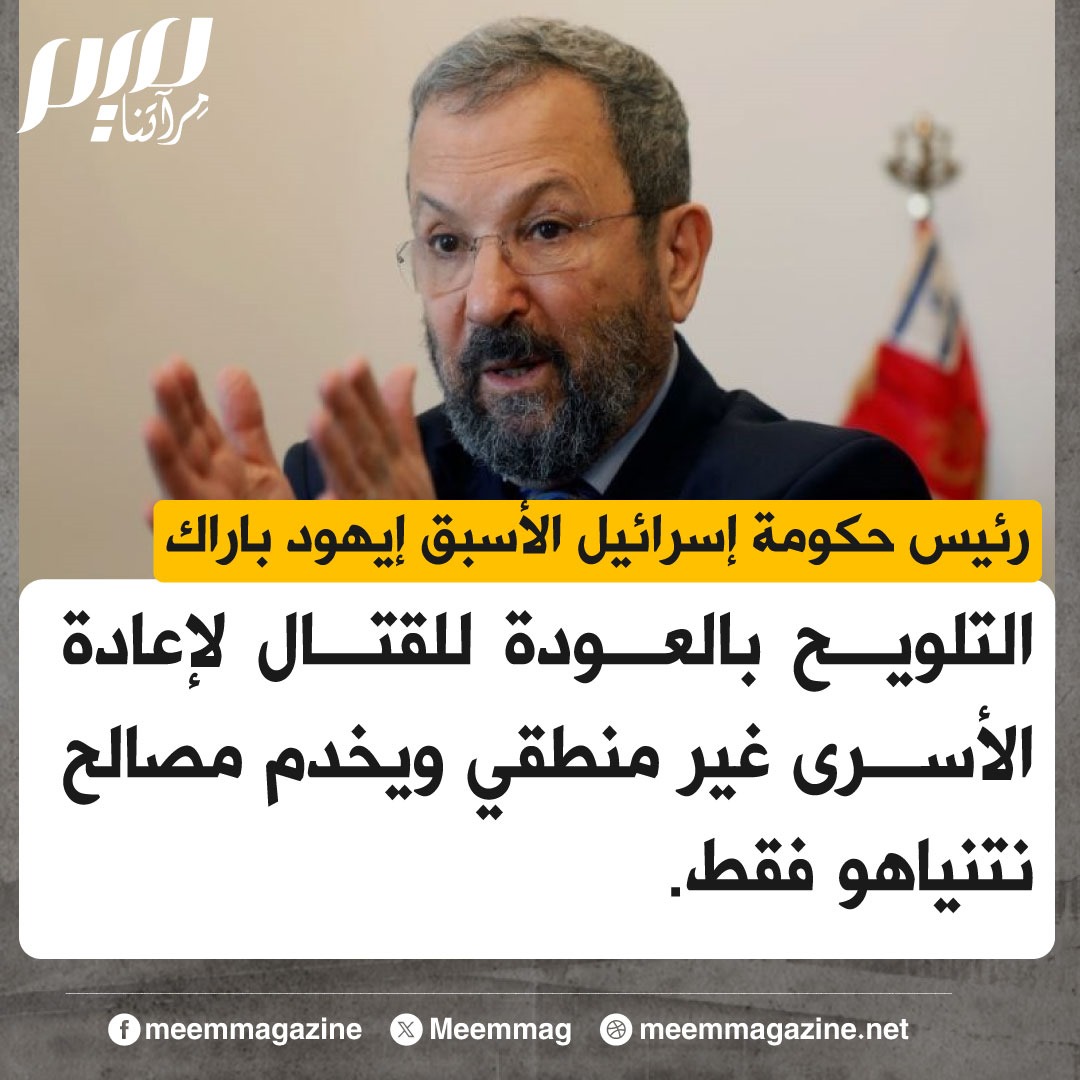 باراك: التلويح بالعودة للقتال لإعادة الأسرى غير منطقي ويخدم مصالح نتنياهو فقط.