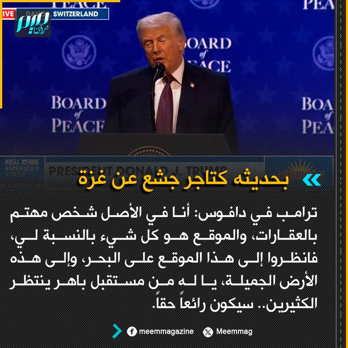 بحديثه كتاجر جشع عن غزة.. ترامب في منتدى دافوس بسويسرا: أنا في الأصل شخص مهتم بالعقارات، والموقع هو كل شيء بالنسبة لي، فانظروا إلى هذا الموقع على البحر، وإلى هذه الأرض الجميلة، يا له من مستقبل باهر ينتظر الكثيرين.. سيكون رائعاً حقاً.
