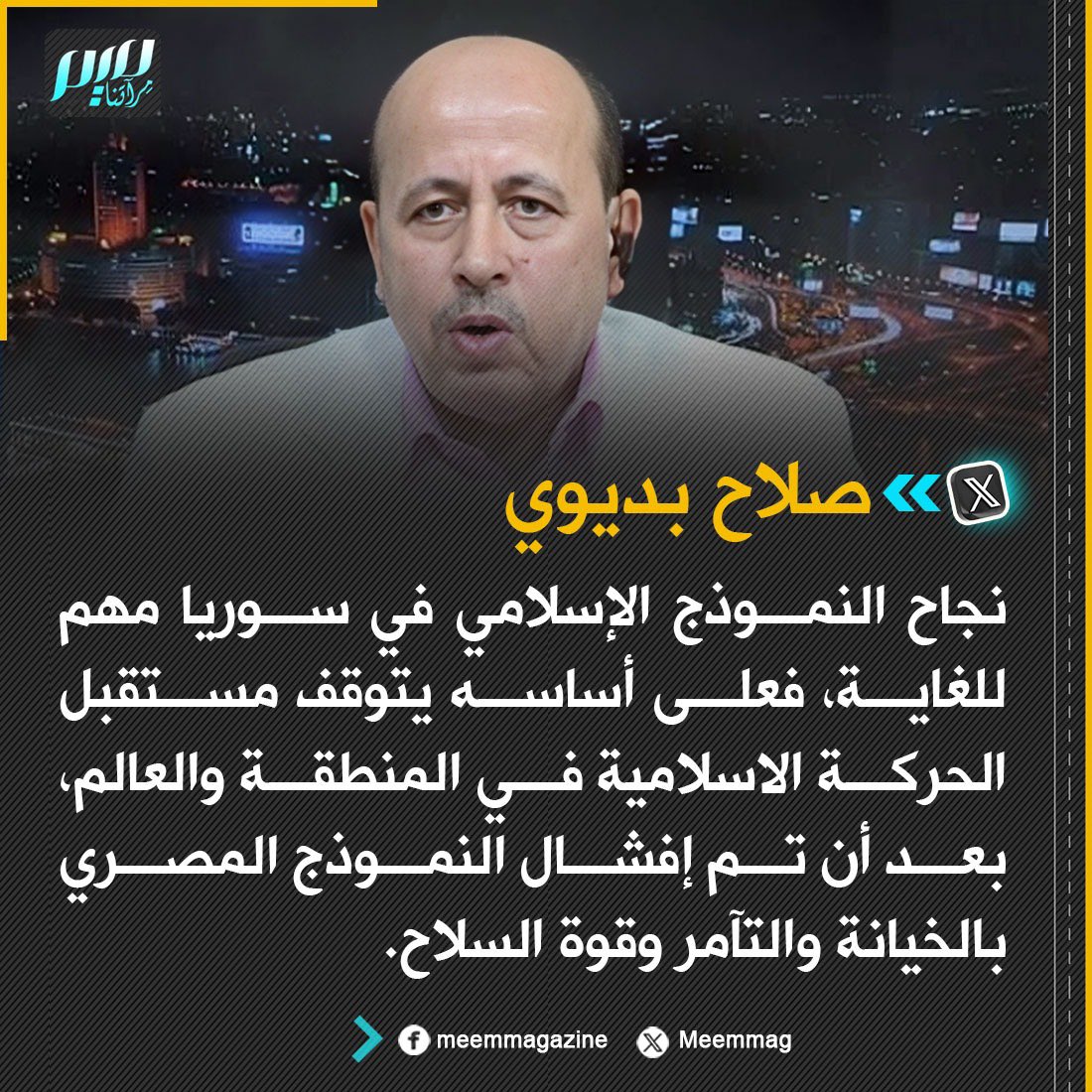 بديوي: نجاح النموذج الإسلامي في سوريا مهم للغاية، فعلى أساسه يتوقف مستقبل الحركة الاسلامية في المنطقة والعالم، بعد أن تم إفشال النموذج المصري بالخيانة والتآمر وقوة السلاح.
