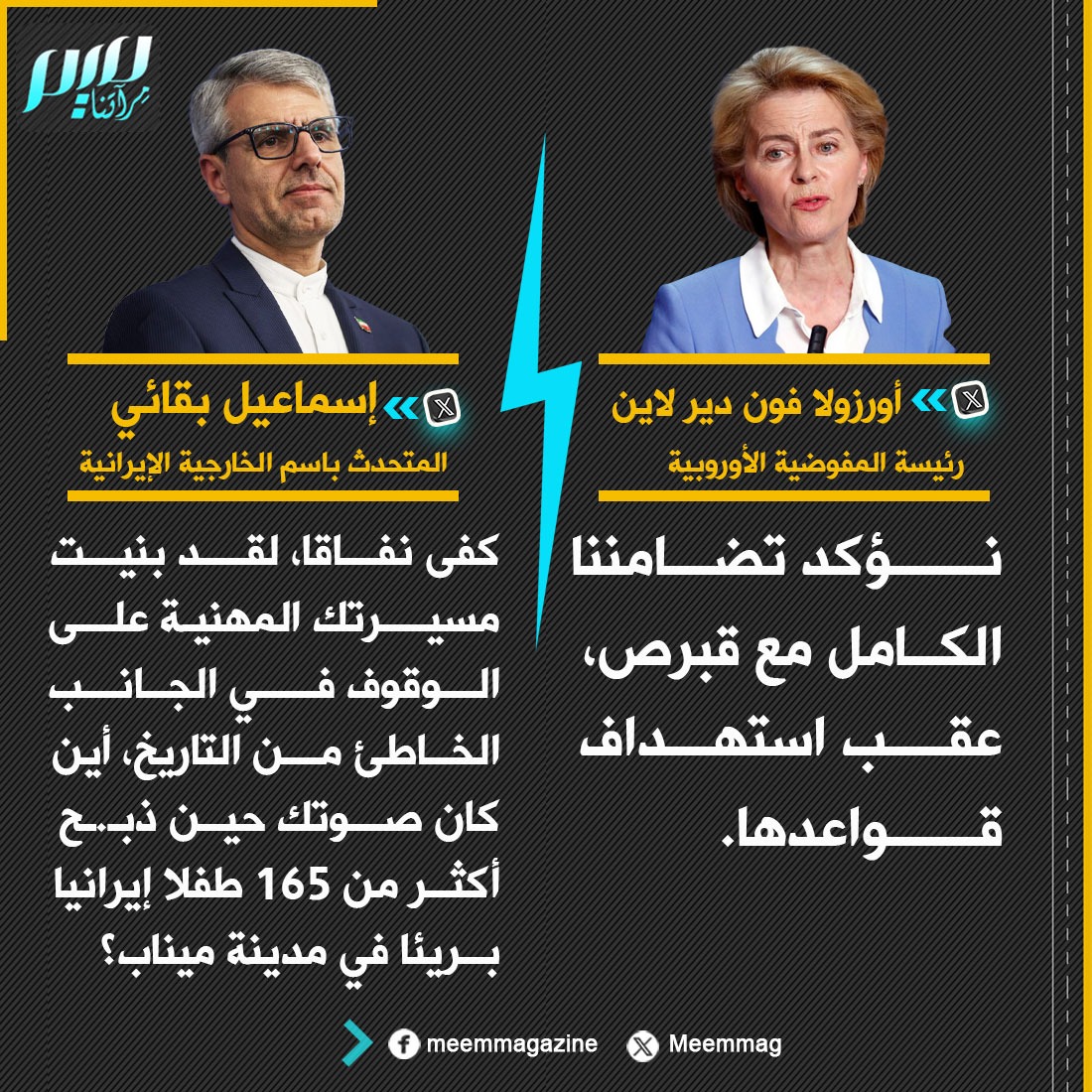 بقائي لرئيسة المفوضية الأوروبية: كفى نفاقا، لقد بنيت مسيرتك المهنية على الوقوف في الجانب الخاطئ من التاريخ، أين كان صوتك حين ذُبـ.ـح أكثر من 165 طفلا إيرانيا بريئا في مدينة ميناب؟