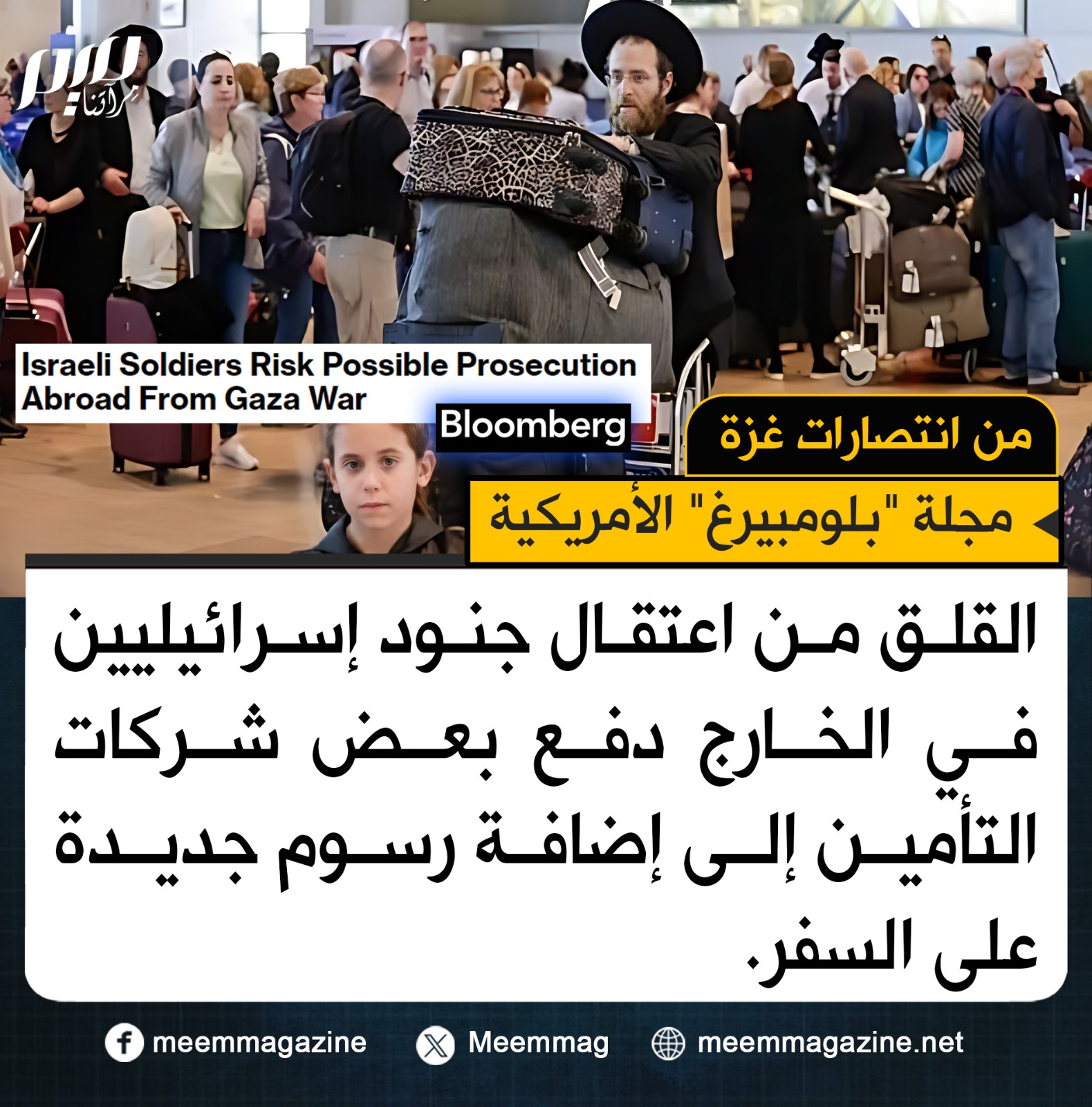 من انتصارات غزة.. بلومبيرغ: القلق من اعتقال جنود إسرائيليين في الخارج دفع بعض شركات التأمين إلى إضافة رسوم جديدة على السفر.