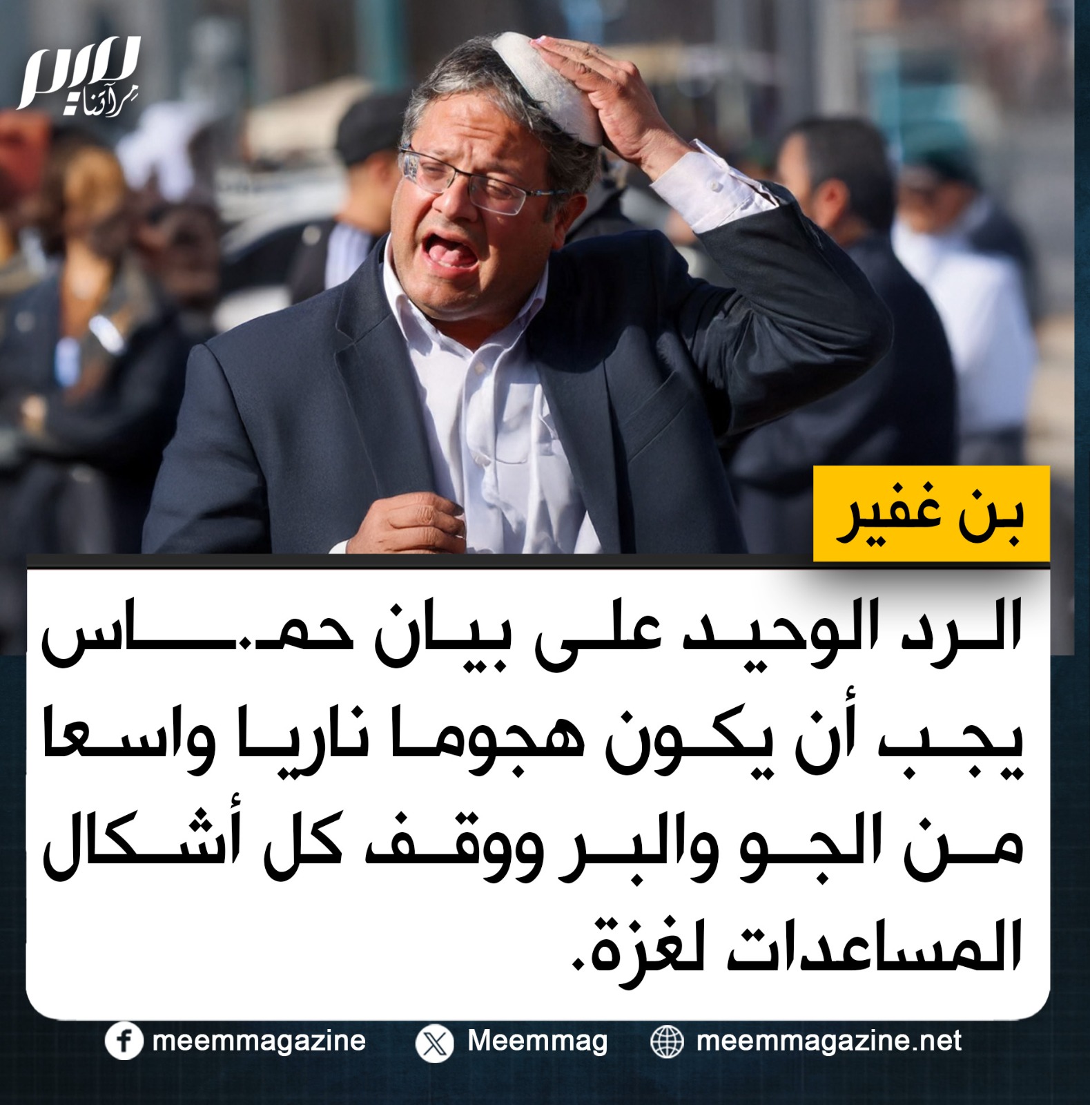 بن غفير: الرد الوحيد على بيان حمـ.ــــاس يجب أن يكون هجوما ناريا واسعا من الجو والبر ووقف كل أشكال المساعدات لغزة.
