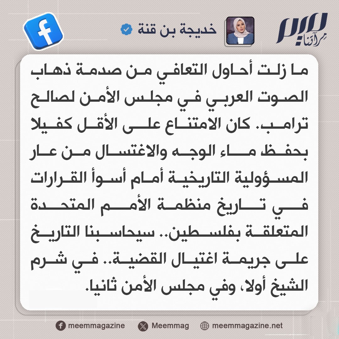الإعلامية خديجة بن قنة: ما زلت أحاول التعافي من صدمة ذهاب الصوت العربي في مجلس الأمن لصالح ترامب.
