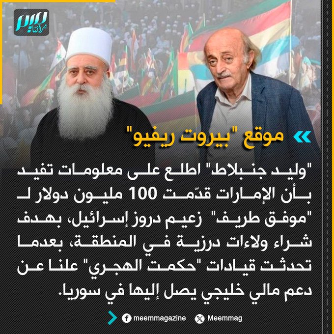 موقع "بيروت ريفيو": "وليد جنبلاط" اطلع على معلومات تفيد بأن الإمارات قدّمت 100 مليون دولار لـ "موفق طريف" زعيم دروز إسرائيل، بهدف شراء ولاءات درزية في المنطقة، بعدما تحدثت قيادات "حكمت الهجري" علنا عن دعم مالي خليجي يصل إليها في سوريا.