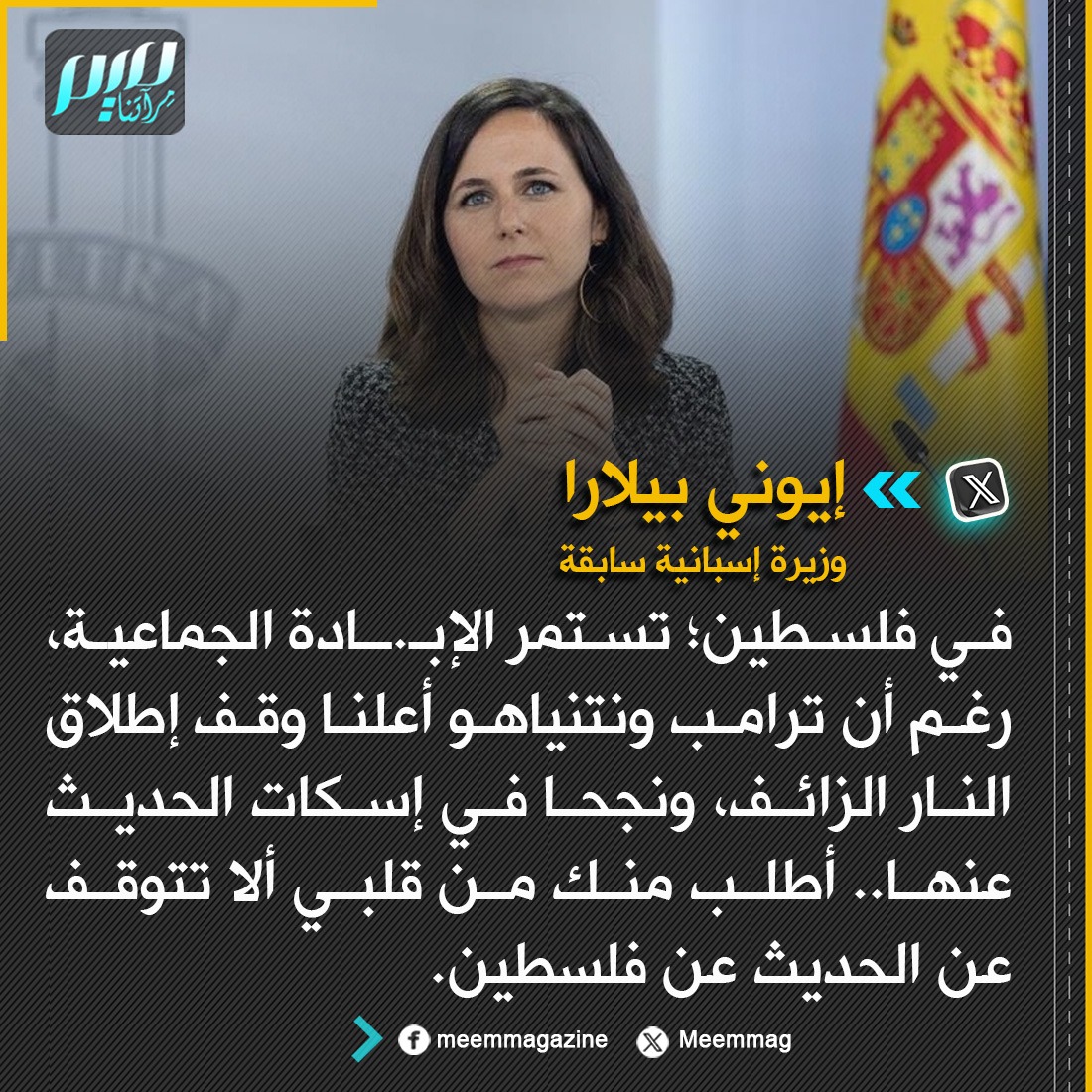 الوزيرة الإسبانية السابقة إيوني بيلارا: أطلب منك من قلبي ألا تتوقف عن الحديث عن فلسطين.