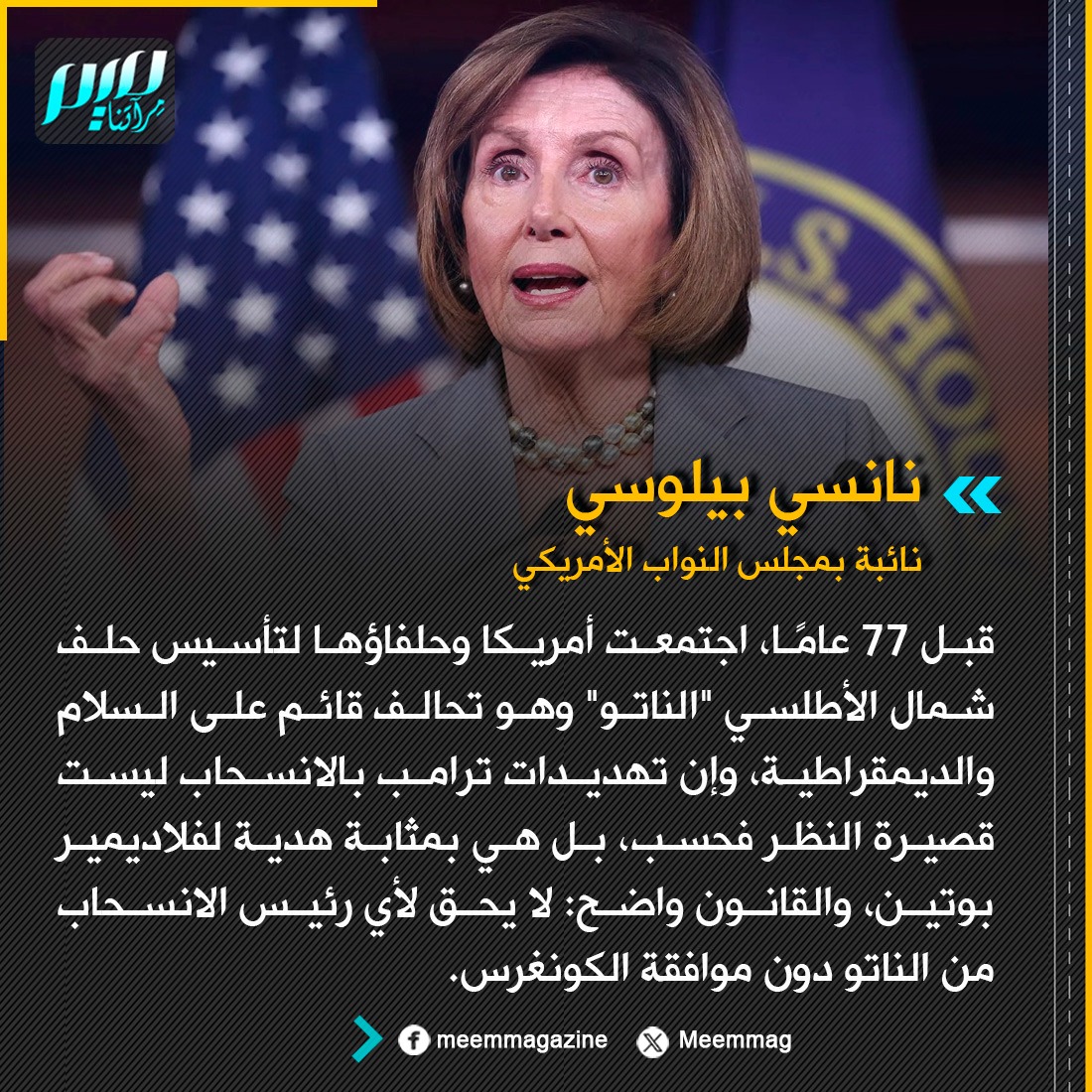 بيلوسي: قبل 77 عامًا، اجتمعت أمريكا وحلفاؤها لتأسيس حلف شمال الأطلسي "الناتو" وهو تحالف قائم على السلام والديمقراطية، وإن تهديدات ترامب بالانسحاب ليست قصيرة النظر فحسب، بل هي بمثابة هدية لفلاديمير بوتين، والقانون واضح: لا يحق لأي رئيس الانسحاب من الناتو دون موافقة الكونغرس.