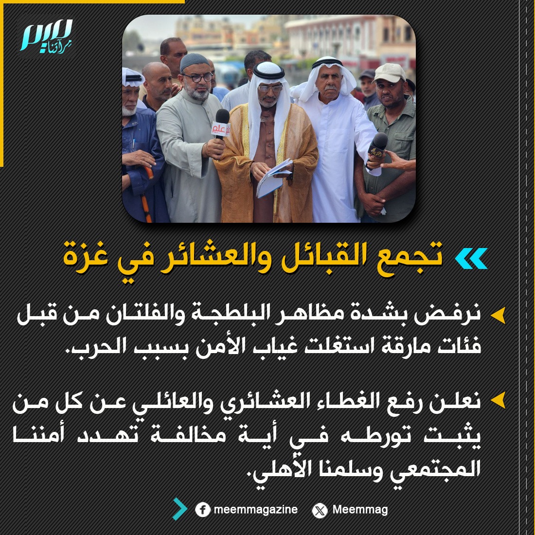 تجمع القبائل والعشائر في غزة: نعلن رفع الغطاء العشائري والعائلي عن كل من يثبت تورطه في أية مخالفة تهدد أمننا المجتمعي وسلمنا الأهلي.