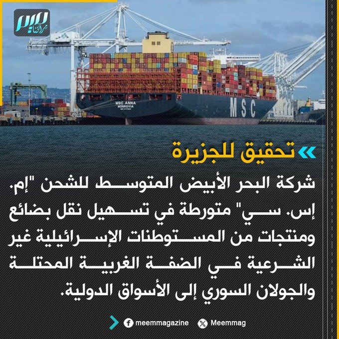 تحقيق للجزيرة: شركة البحر الأبيض المتوسط للشحن "إم. إس. سي" متورطة في تسهيل نقل بضائع ومنتجات من المستوطنات الإسرائيلية غير الشرعية في الضفة الغربية المحتلة والجولان السوري إلى الأسواق الدولية.