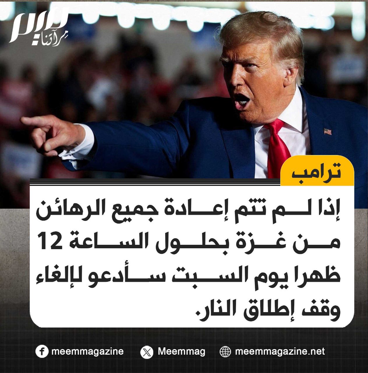 ترامب مهددا: إذا لم تتم إعادة جميع الرهائن من غزة بحلول الساعة 12 ظهرا يوم السبت سأدعو لإلغاء وقف إطلاق النار.