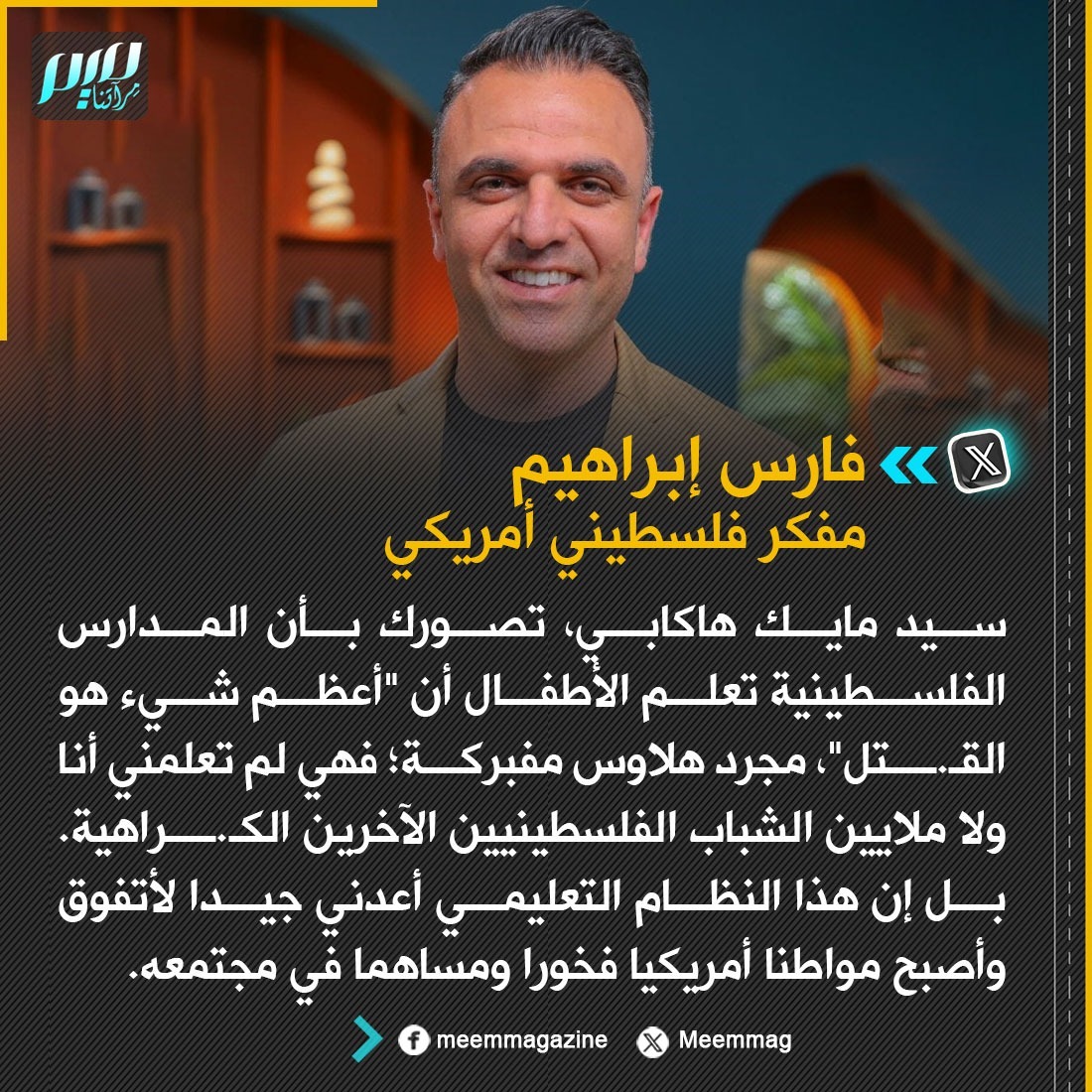 تعليق ناري للمفكر الفلسطيني الأمريكي فارس إراهيم على تصريح السفير الأمريكي في إسرائيل مايك هاكابي قال فيه، إن "المدارس الفلسطينية تعلم الأطفال أن أعظم شيء هو القـ.ـتل".