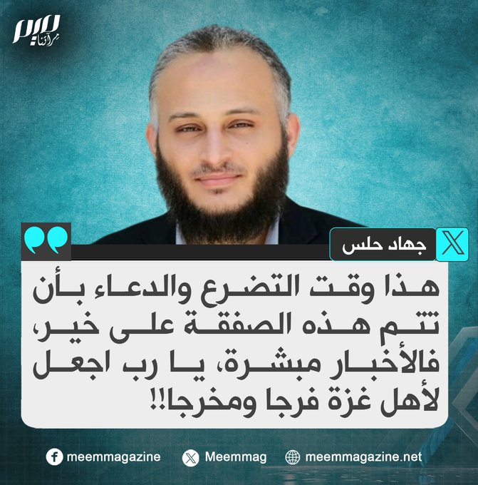 جهاد حلس: هذا وقت التضرع والدعاء بأن تتم هذه الصفقة على خير، فالأخبار مبشرة، يا رب اجعل لأهل غزة فرجا ومخرجا!!