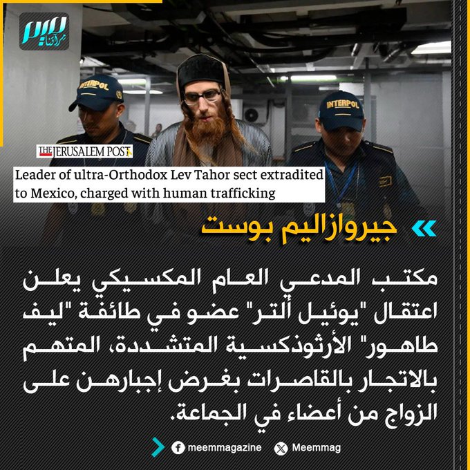 جيروازاليم بوست: مكتب المدعي العام المكسيكي يعلن اعتقال "يوئيل ألتر" عضو في طائفة "ليف طاهور" الأرثوذكسية المتشددة، المتهم بالاتجار بالقاصـ ـرات بغرض إجبارهن على الزواج من أعضاء في الجماعة.