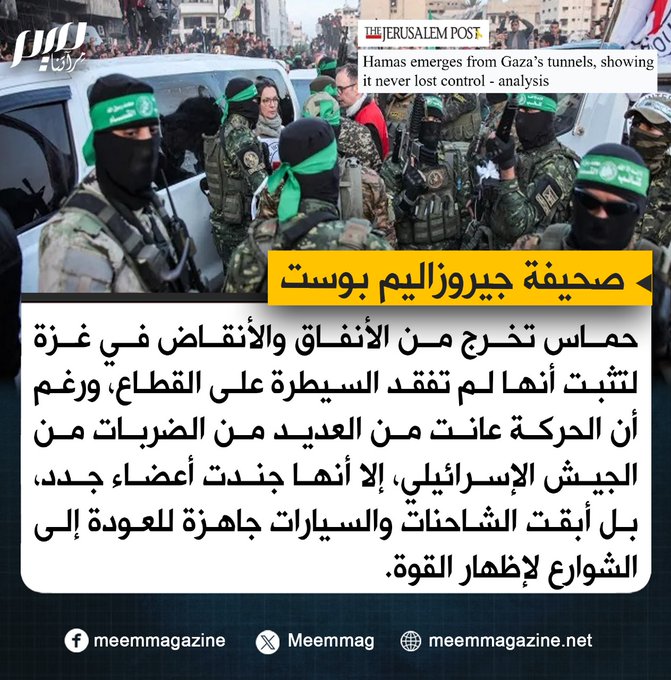 جيروزاليم بوست: حماس تخرج من الأنفاق والأنقاض في غزة لتثبت أنها لم تفقد السيطرة على القطاع، ورغم أن الحركة عانت من العديد من الضربات من الجيش الإسرائيلي، إلا أنها جندت أعضاء جدد، بل أبقت الشاحنات والسيارات جاهزة للعودة إلى الشوارع لإظهار القوة.