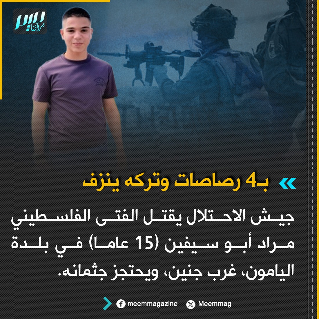 الضفة الغربية.. جيش الاحتلال يقتل الفتى الفلسطيني مراد أبو سيفين (15 عاما) في بلدة اليامون، غرب جنين، ويحتجز جثمانه.