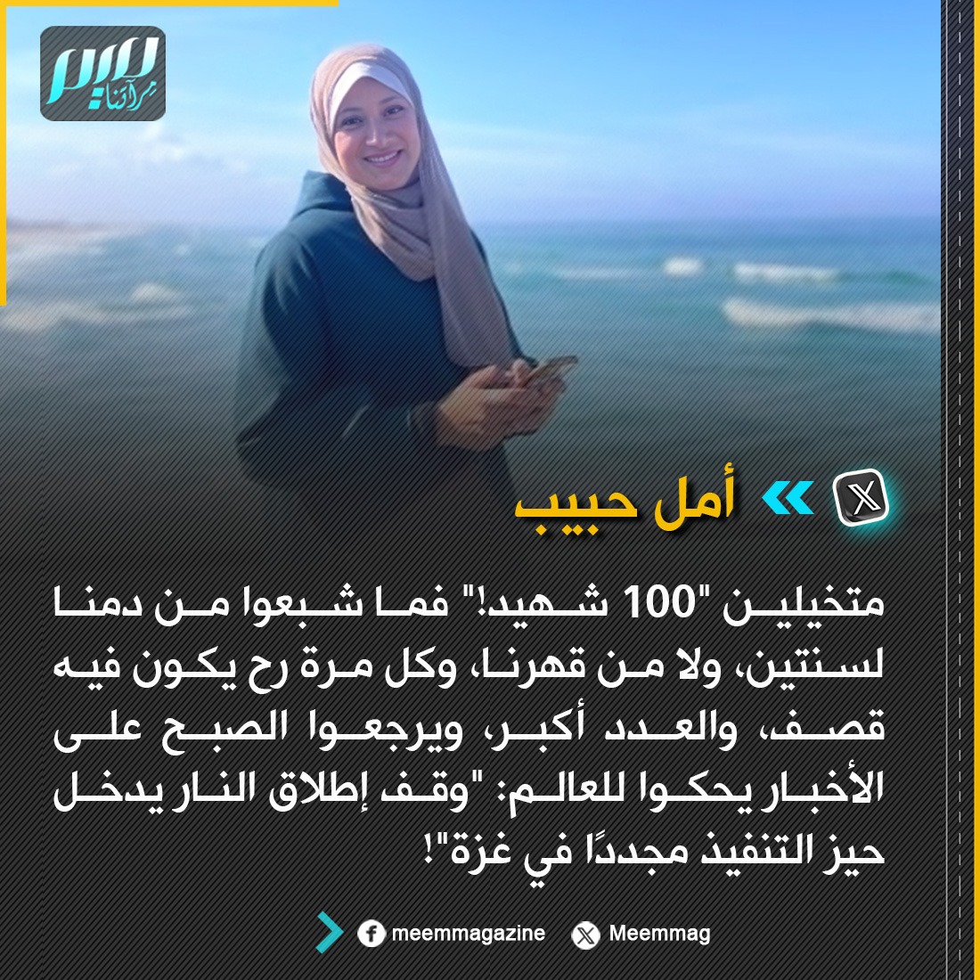 حبيب: متخيلين "100 شهيد!" فما شبعوا من دمنا لسنتين، ولا من قهرنا، وكل مرة رح يكون فيه قصف، والعدد أكبر، ويرجعوا الصبح على الأخبار يحكوا للعالم: "وقف إطلاق النار يدخل حيز التنفيذ مجددًا في غزة"!
