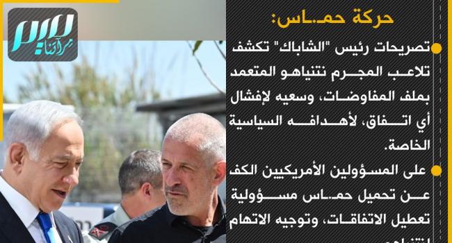 حركة حمـ.ـاس: تصريحات رئيس "الشاباك" تكشف تلاعب المجرم نتنياهو المتعمد بملف المفاوضات، وسعيه لإفشال أي اتفاق، لأهدافه السياسية الخاصة.