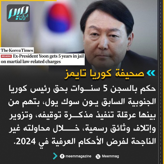 حكم بالسجن 5 سنوات بحق رئيس كوريا الجنوبية السابق يون سوك يول، بتهم من بينها عرقلة تنفيذ مذكرة توقيفه، وتزوير وإتلاف وثائق رسمية، خلال محاولته غير الناجحة لفرض الأحكام العرفية في 2024.