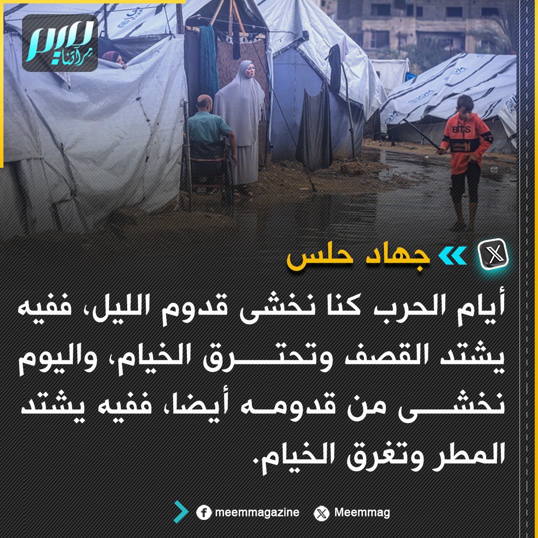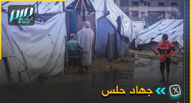 حلس: أيام الحرب كنا نخشى قدوم الليل، ففيه يشتد القصف وتحترق الخيام، واليوم نخشى من قدومه أيضا، ففيه يشتد المطر وتغرق الخيام.