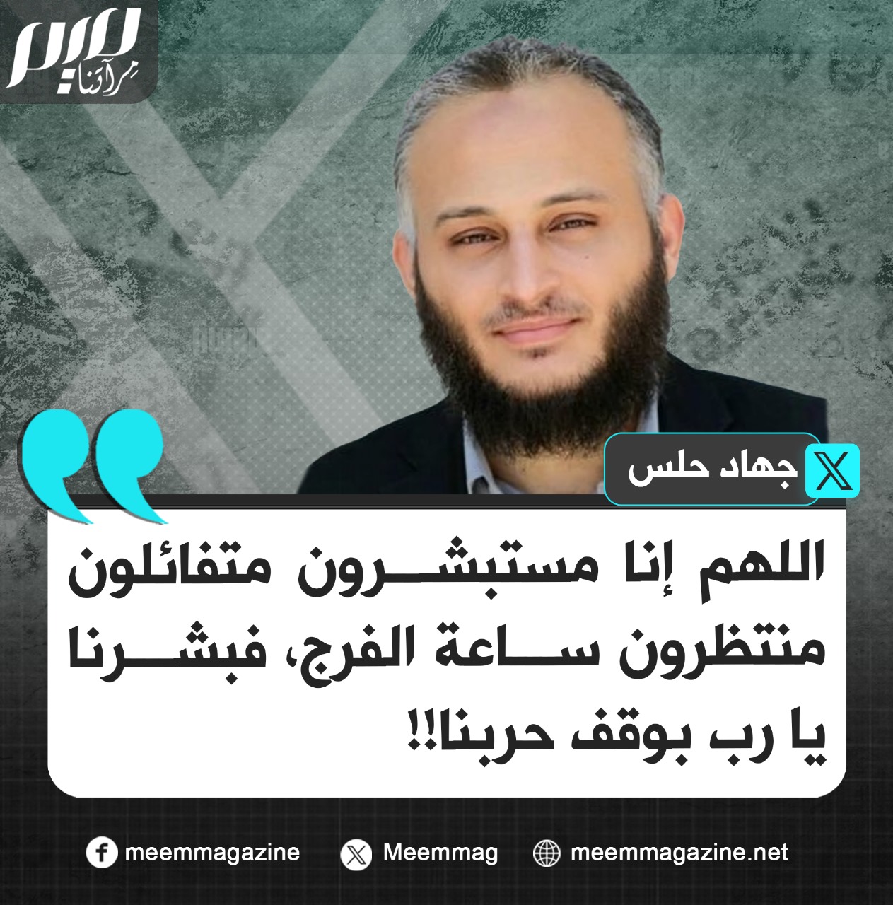 حلس: اللهم إنا مستبشرون متفائلون منتظرون ساعة الفرج، فبشرنا يا رب بوقف حربنا!!