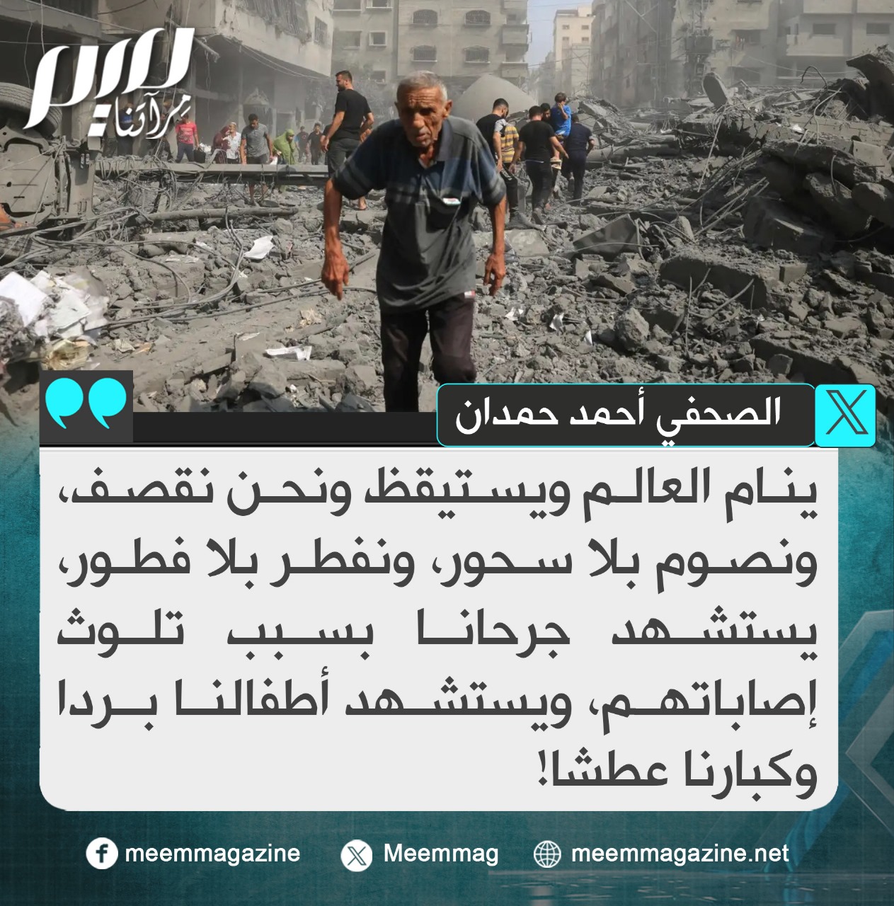 حمدان: ينام العالم ويستيقظ ونحن نقصف، ونصوم بلا سحور، ونفطر بلا فطور، يستشهد جرحانا بسبب تلوث إصاباتهم، ويستشهد أطفالنا بردا وكبارنا عطشا!