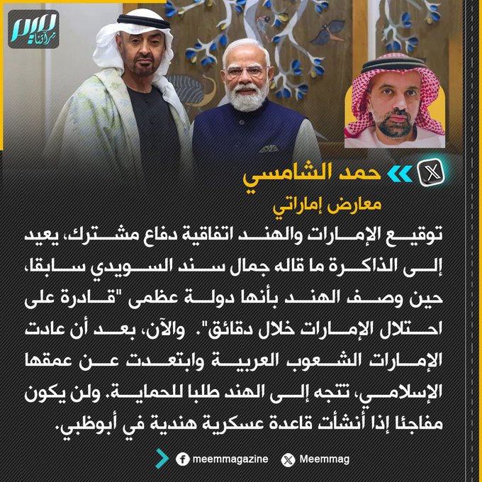 حمد الشامسي: الإمارات عادت الشعوب العربية وابتعدت عن عمقها الإسلامي، وهاهي اليوم تتجه إلى الهند طلبا للحماية. ولن يكون مفاجئا إذا أنشأت قاعدة عسكرية هندية في أبوظبي!