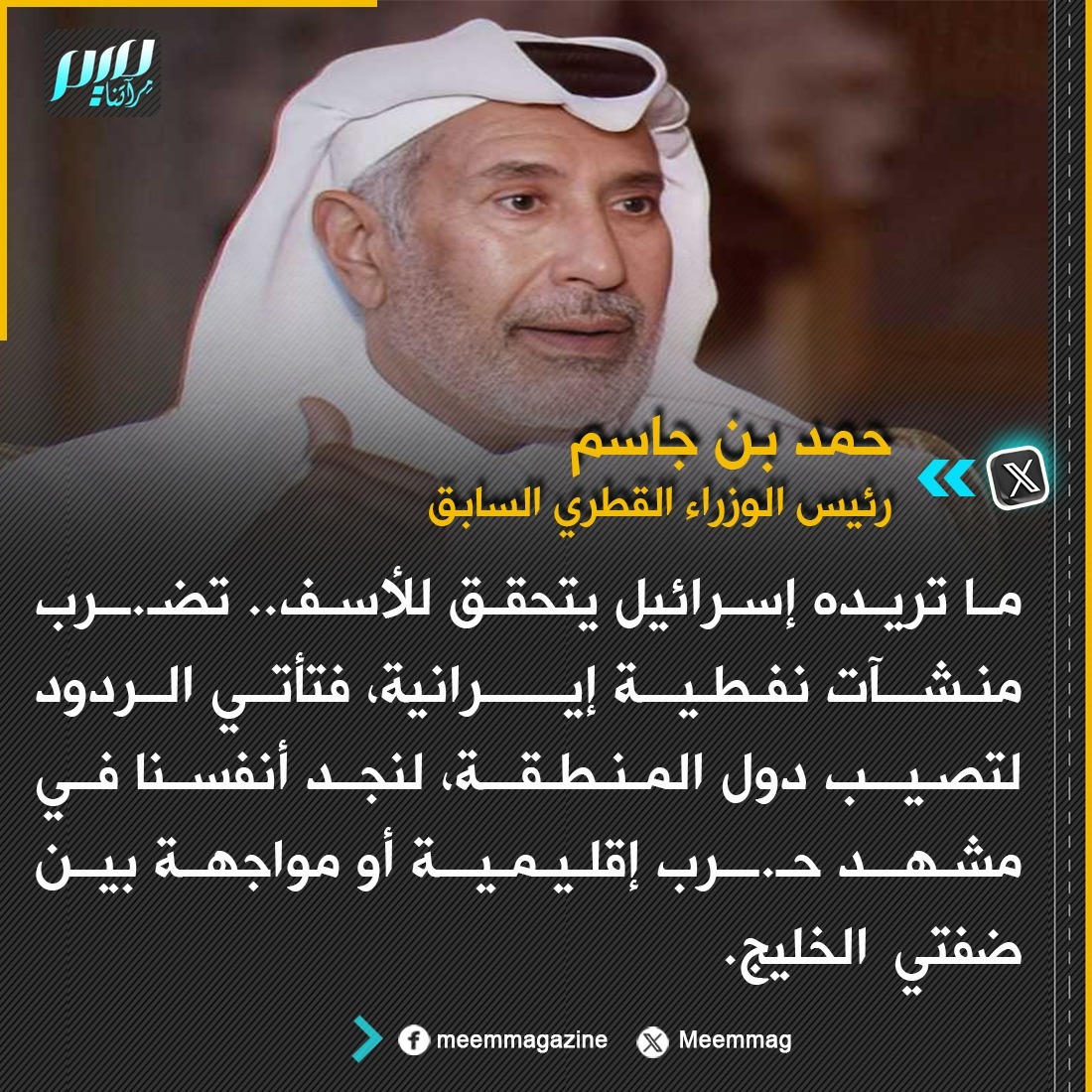 حمد بن جاسم: ما تريده إسرائيل يتحقق للأسف.. تضـ.ـرب منشآت نفطية إيرانية، فتأتي الردود لتصيب دول المنطقة، لنجد أنفسنا في مشهد حـ.ـرب إقليمية أو مواجهة بين ضفتي الخليج.