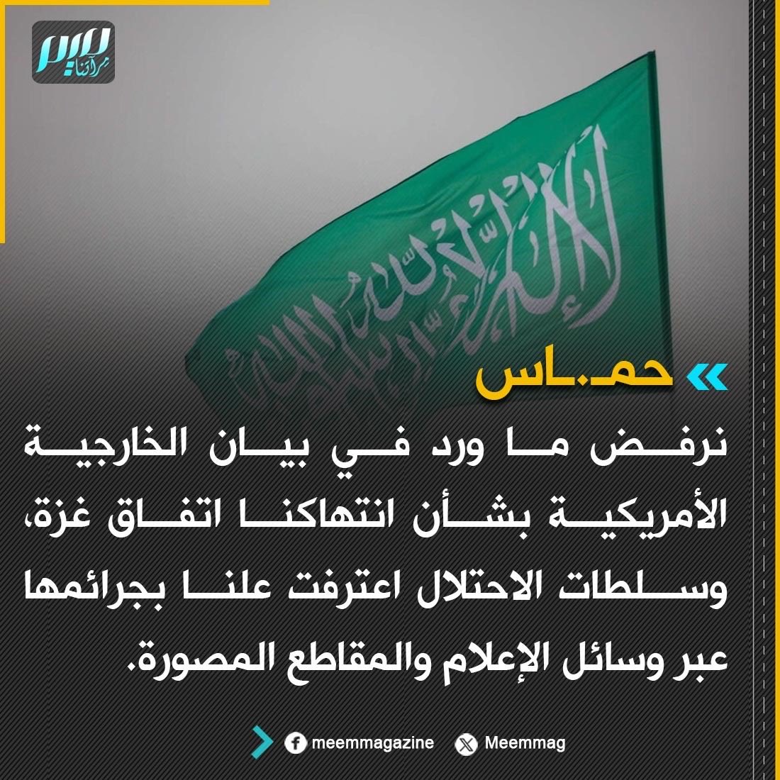 حمـ.ـاس: نرفض ما ورد في بيان الخارجية الأمريكية بشأن انتهاكنا اتفاق غزة، وسلطات الاحتلال اعترفت علنا بجرائمها عبر وسائل الإعلام والمقاطع المصورة.