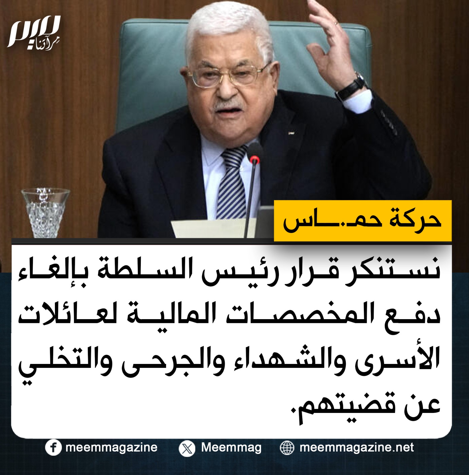 حمـ.ـــاس: نستنكر قرار رئيس السلطة بإلغاء دفع المخصصات المالية لعائلات الأسرى والشهداء والجرحى والتخلي عن قضيتهم.