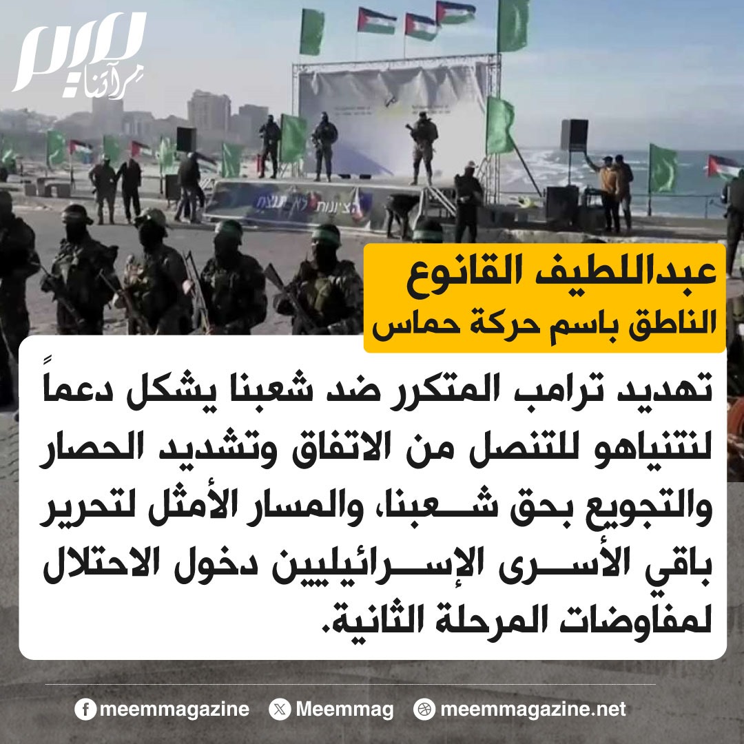 حمـ ـاس: تهديد ترامب المتكرر ضد شعبنا يشكل دعماً لنتنياهو للتنصل من الاتفاق وتشديد الحصار والتجويع بحق شعبنا.