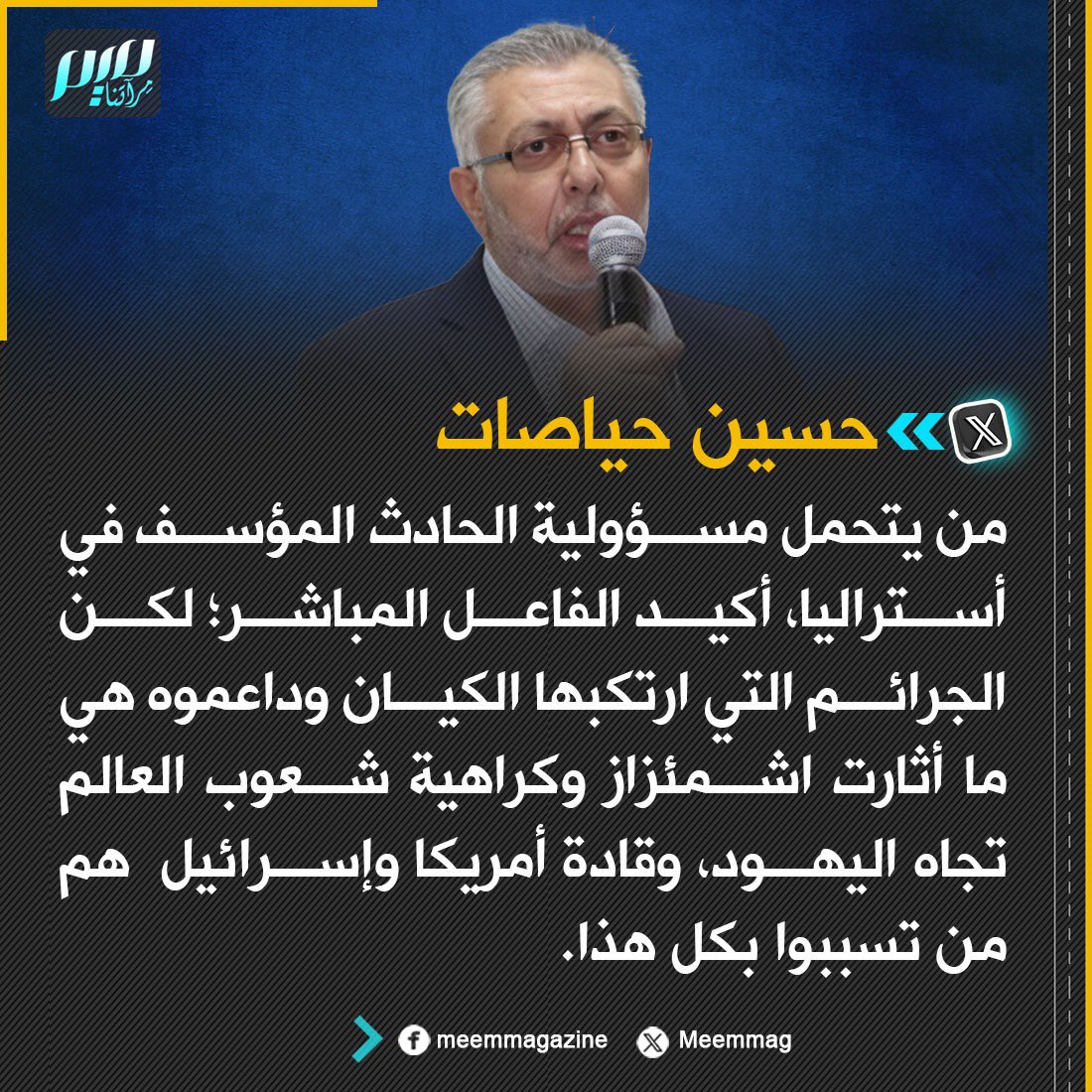 حياصات: من يتحمل مسؤولية الحادث المؤسف في أستراليا، أكيد الفاعل المباشر؛ لكن الجرائم التي ارتكبها الكيان وداعموه هي ما أثارت اشمئزاز وكراهية شعوب العالم تجاه اليهود، وقادة أمريكا وإسرائيل هم من تسببوا بكل هذا.