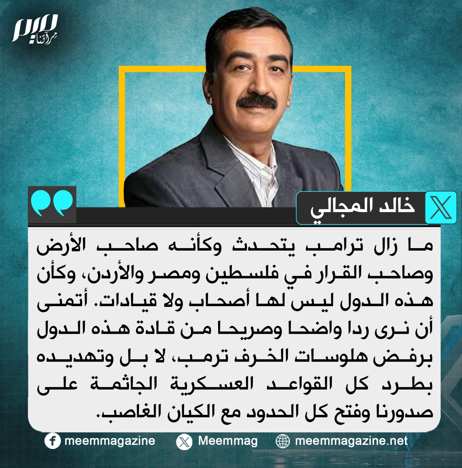 خالد المجالي: أتمنى أن نرى ردا واضحا وصريحا من قادة هذه الدول برفض هلوسات الخرف ترامب، لا بل وتهديده بطرد كل القواعد العسكرية الجاثمة على صدورنا وفتح كل الحدود مع الكيان الغاصب.