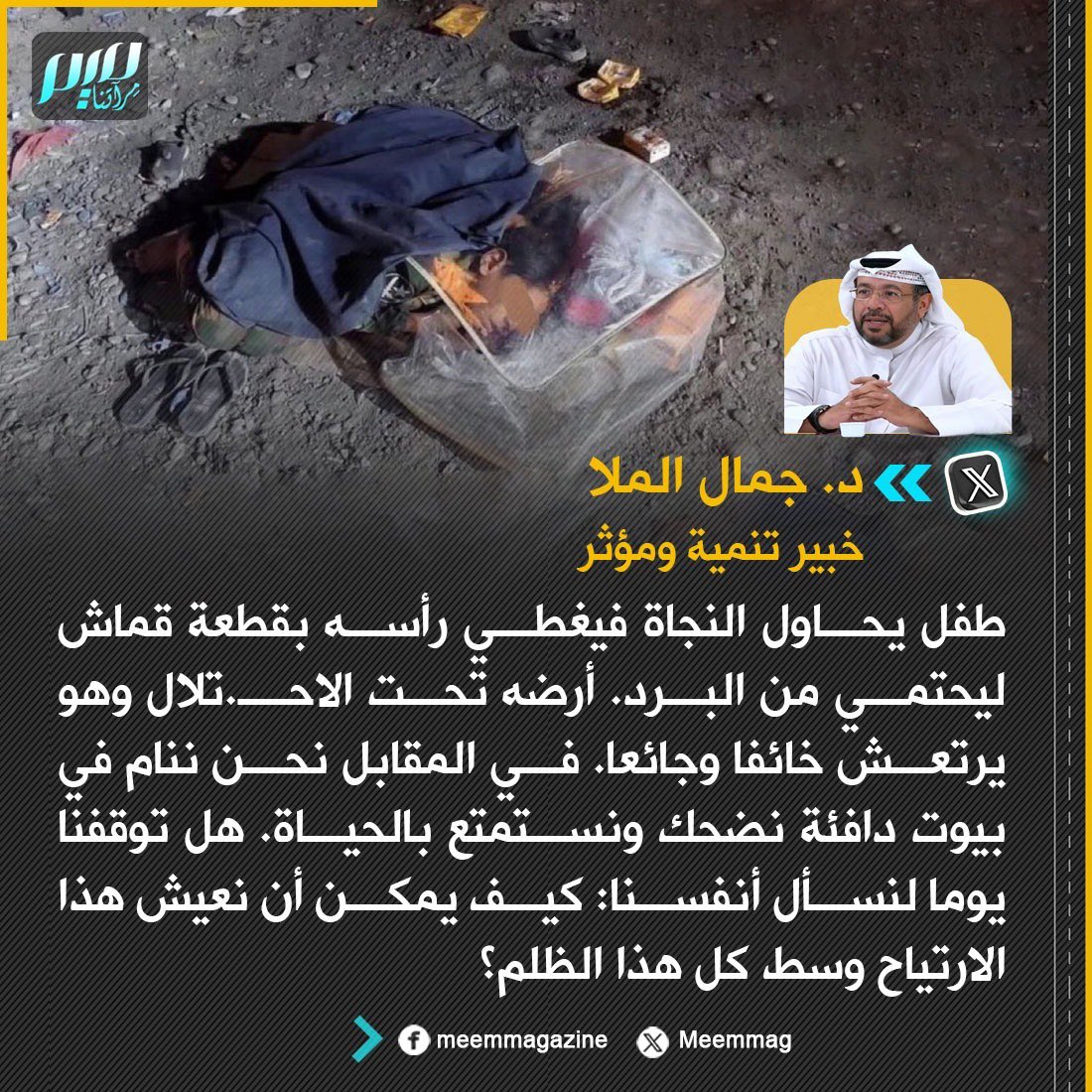 د. جمال الملا: طفل يحاول النجاة فيغطي رأسه بقطعة قماش ليحتمي من البرد. أرضه تحت الاحـ.تلال وهو يرتعش خائفا وجائعا. في المقابل نحن ننام في بيوت دافئة نضحك ونستمتع بالحياة. هل توقفنا يوما لنسأل أنفسنا: كيف يمكن أن نعيش هذا الارتياح وسط كل هذا الظلم؟