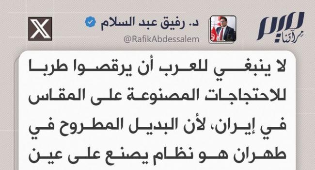 وزير خارجية تونس الأسبق د. رفيق عبد السلام: لا ينبغي للعرب أن يرقصوا طربًا للاحتجاجات المصنوعة على المقاس في إيران، لأن البديل المطروح في طهران هو نظام يصنع على عين تل أبيب.