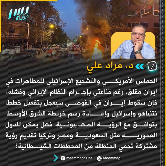 د. مراد علي: حماس أمريكا، وتشجيع إسرائيل للمظاهرات في إيران مقلق، وسيعجل بتفعيل خطط نتنياهو، وإعادة رسم خريطة الشرق الأوسط بتوافق مع الرؤية الصهـ.ـيونـ.ـية.
