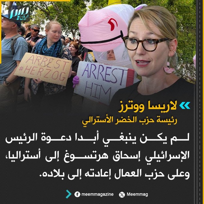 رئيسة حزب الخضر الأسترالي: لم يكن ينبغي أبدا دعوة الرئيس الإسرائيلي إسحاق هرتسوغ إلى أستراليا، وعلى حزب العمال إعادته إلى بلاده.