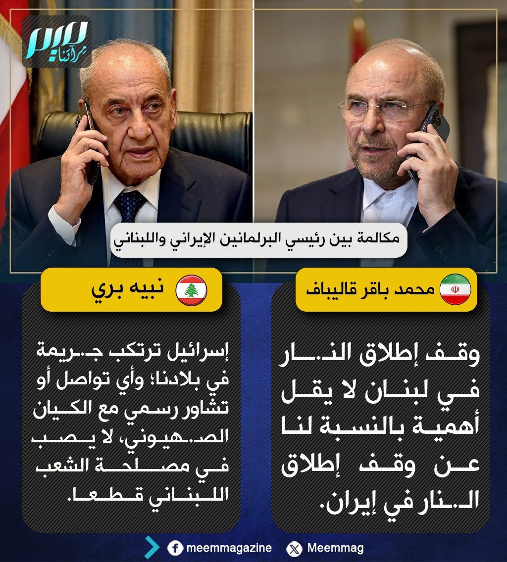 رئيس البرلمان الإيراني قاليباف في اتصال هاتفي مع نظيره نبيه بري: وقف إطلاق النار في لبنان لا يقل أهمية بالنسبة لنا عن وقف إطلاق النار في إيران.